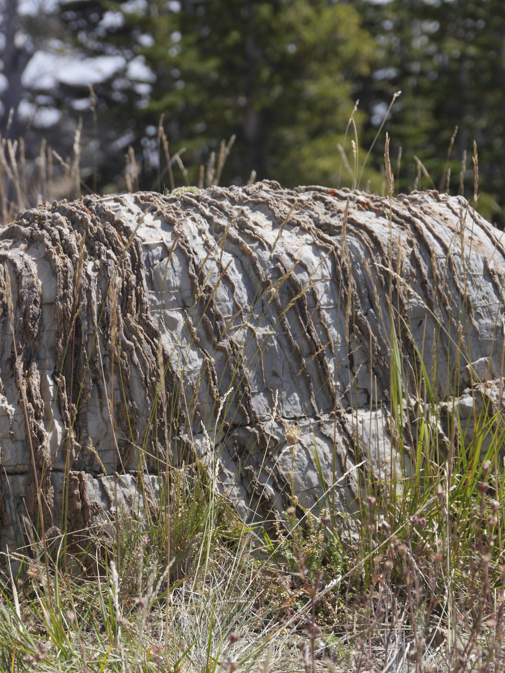 Typical outcrop of the Precambrian Nash Fork Formation. Tectonic forces have tilted the original layers into an upright position while deep-seated physical and chemical processes caused silicification (hardening) of the original lime-mud layers.Rock-bearing stromatolites of this age are uncommon and quite different than typical Precambrian rocks we find in Colorado (and in many other places). These stromatolites are essentially sedimentary in nature as they originally formed at or near the earth’s surface. Over time, they have been deeply buried and ‘squeezed’ into meta-sedimentary rocks and then uplifted -most likely during multiple mountain building events in this area. Finally, in a mere fraction of its 2 billion year old history, Ice Age glaciation (which ended about 10,000 years ago) uncovered the wonderful outcrops we visited today.