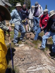 Field trip participants from the Northern Colorado Geologists group listen to Dr. Donald Boyd, Professor Emeritus of Geology from the University of Wyoming offer his thoughtful interpretations on the depositional origin of the Precambrian Nash Fork Formation stromatolites.