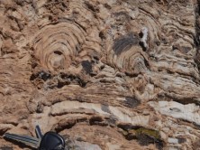 Convex laminae that follow the undulations of the ancient seafloor. A great variety of shapes and forms reflect both original growth patterns as well as sliding, slumping and collapsing of the microbial/sediment mats.So now, we have a 2 billion-year old snapshot of Earth Antiquus where nothing more than simple lifeforms occupied the young Earth. A human visitor would be staring at bare rock everywhere amidst seas whose shallow margins supported the growth of thinly layered microbial mats. Over time- perhaps days, weeks or months, the sticky surfaces trapped lime mud into delicate wavy strata resulting in undulating domes and troughs that are the tell-tale signs of once living stromatolites. How do we know this?